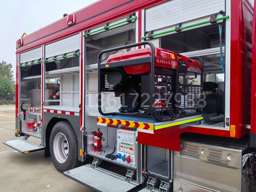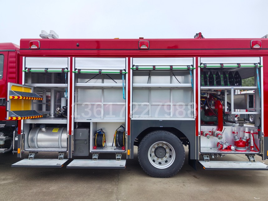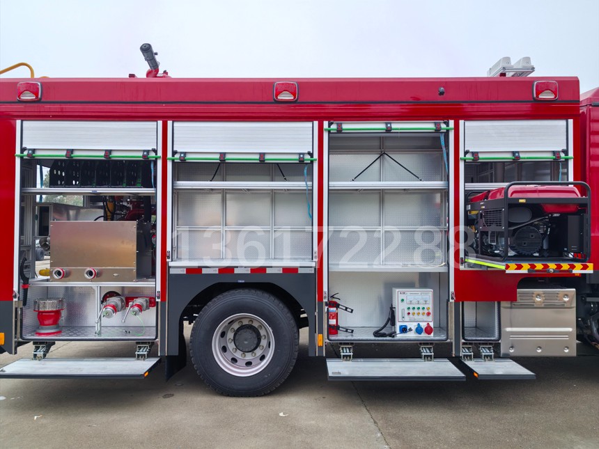 其他 | 載液罐體為304不銹鋼,與底盤采用彈性連接,載水3550kg,A類泡沫液量210kg,B類泡沫液量340kg,裝備了美國希爾生產(chǎn)的PTO CAFS120/50FBU型消防車用壓縮空氣泡沫系統(tǒng),空壓機流量3400L/min,水泵流量3600L/min,泡沫泵流量12.5L/min,壓縮空氣泡沫混合液總流量5500L/min,車頂法國博克PLKD48-SNAKE2.5(威斯特電控泡沫炮)。 |