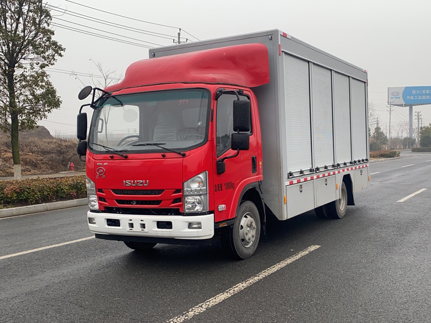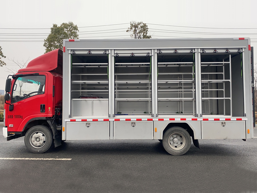 慶鈴裝備車由底盤、液壓尾板、器材箱等組成,內部設置隔間,可根據運輸設備的外形尺寸及特點固定、安裝,用于后勤保障,向一線輸送特種裝備。該車系選用慶鈴汽車股份有限公司生產的QL1110ANKAY二類汽車底盤改裝而成,原裝單排駕駛室,可載含駕駛員在內的乘員3人,駕乘舒適輕便。該車用于消防救援隊裝備運輸,兩側卷簾門,車尾安裝1.5噸液壓尾板,可通過液壓圍板上下車,內部根據轉運器材的結構進行鋁合金器材架的搭建,該車最大的特點是操控性好、維修簡便,可廣泛應用于公安消防隊、醫療衛生、廠礦企業及社區、碼頭等場所。